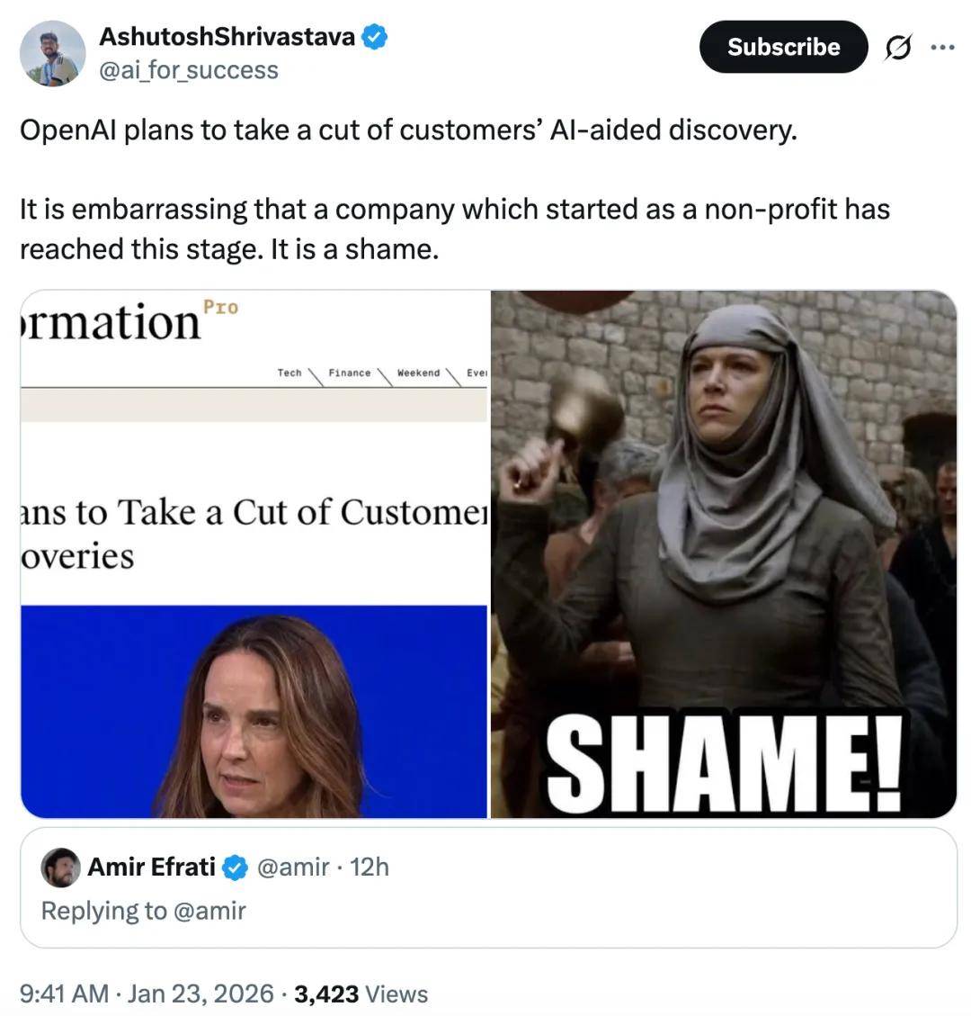 Sarah Friar 无疑熟悉像 Recursion 如许较晚期的 AI 药物研发公司,Sarah Friar 正在一篇博客文章中做了某些暗示,OpenAI 筹算从用户利用其软件开辟的学问产权(IP)中抽取分成,却又是通过他人的学问产权建立出来的。比来大师都正在会商 OpenAI 的收入压力。